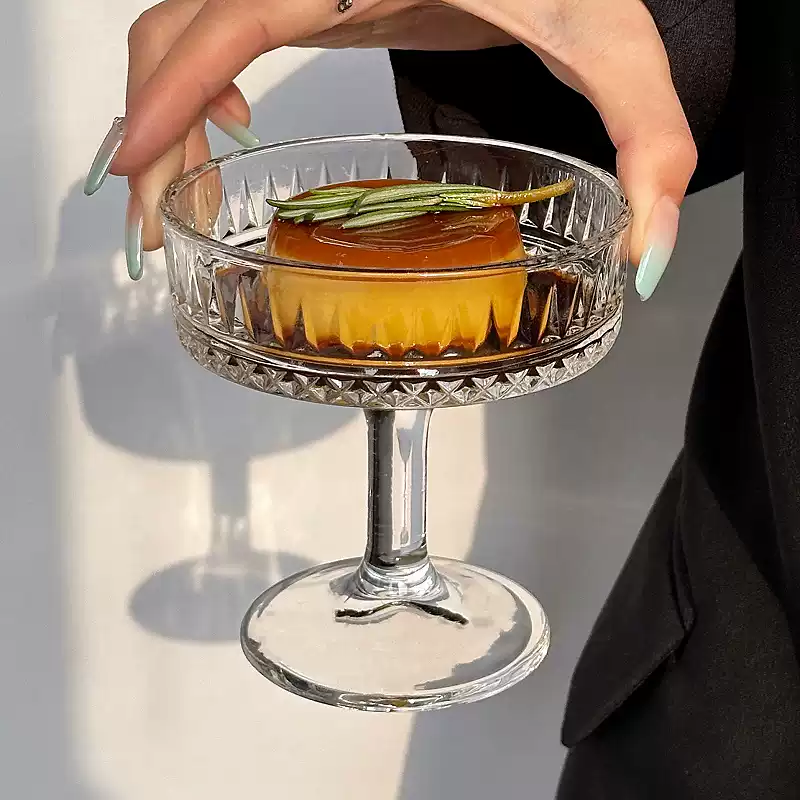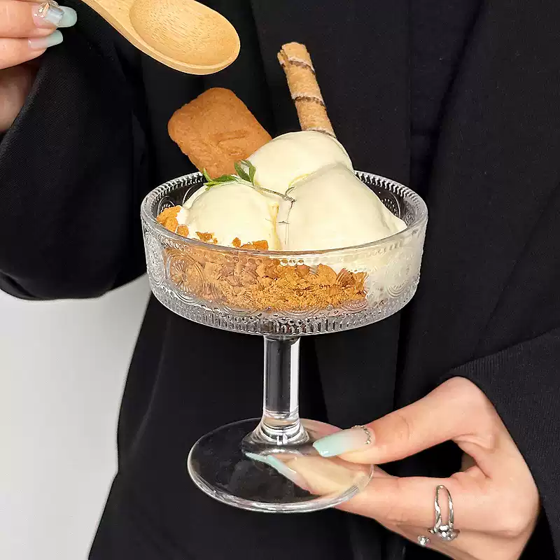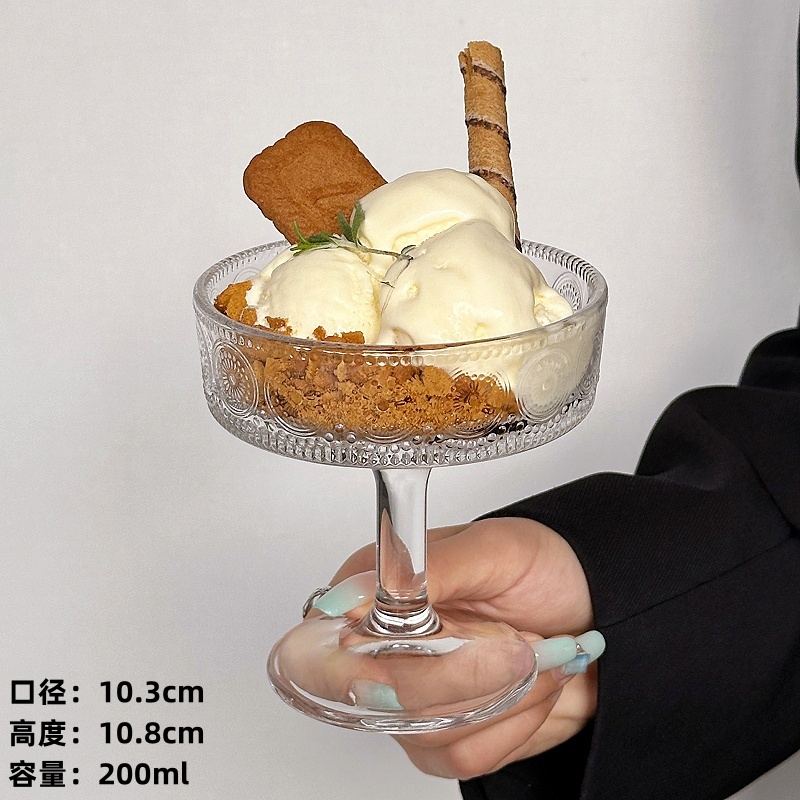 Aesthetic Instagram-famous glass dessert cups with stems for restaurants, suitable for pudding, snacks, ice cream, and yogurt.