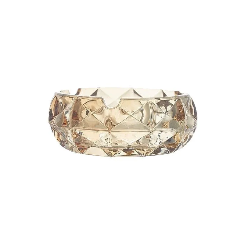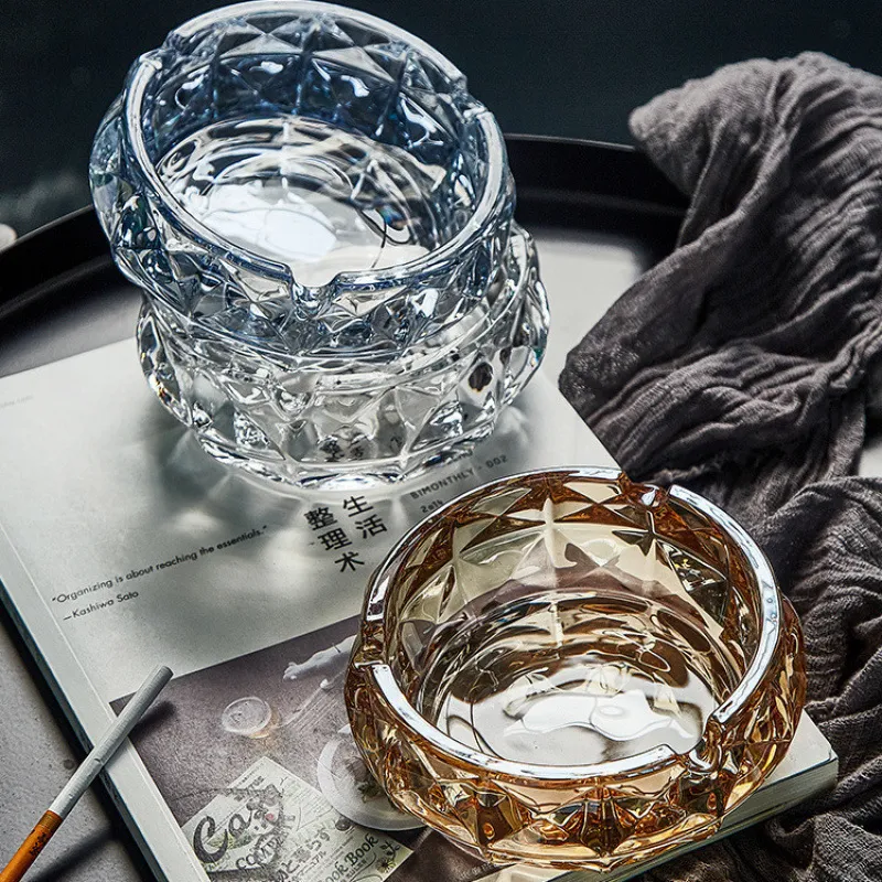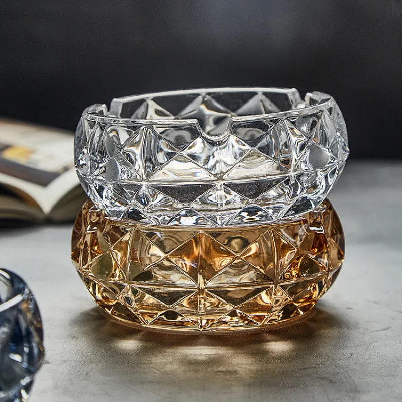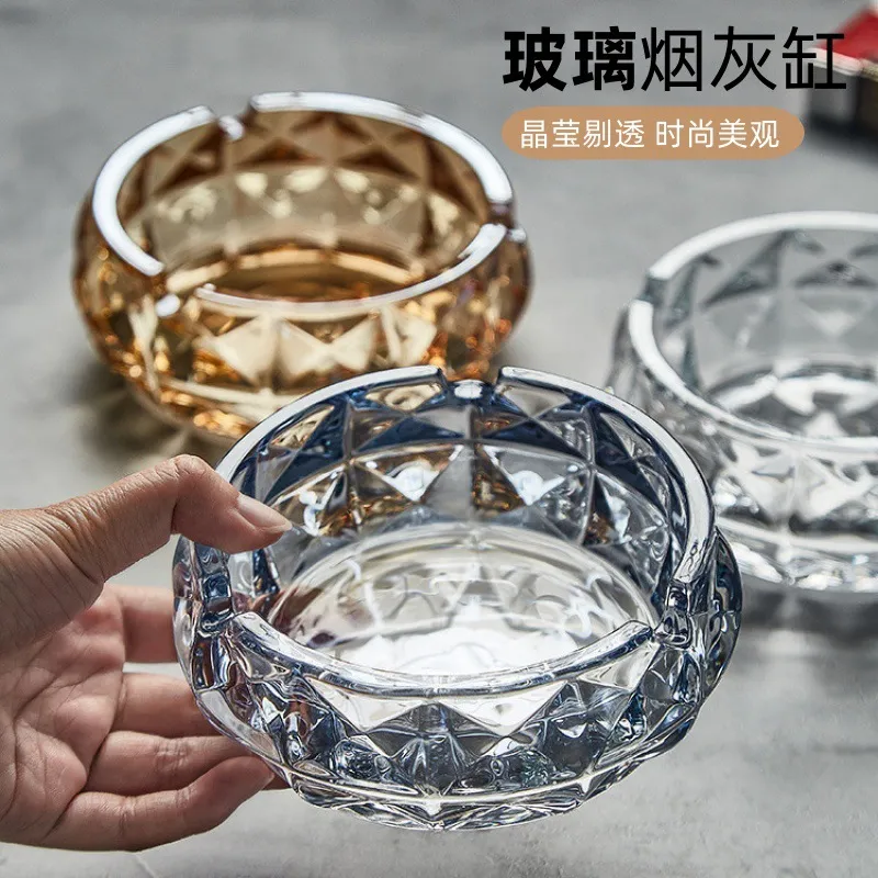 Here is a series of creative glass ashtrays, which are ideal for enhancing the style of both living and commercial spaces. The ashtrays come in different shapes such as round and square, with sizes ranging from 10.5 - 17.3CM, which can adapt to different using scenarios and placement requirements. The surfaces are designed with various textures like diamond - cut and hammer - textured patterns, and there are rich colors including silver, gold, blue, transparent, etc., making them not only a practical tool for holding cigarette ashes but also an exquisite decoration.