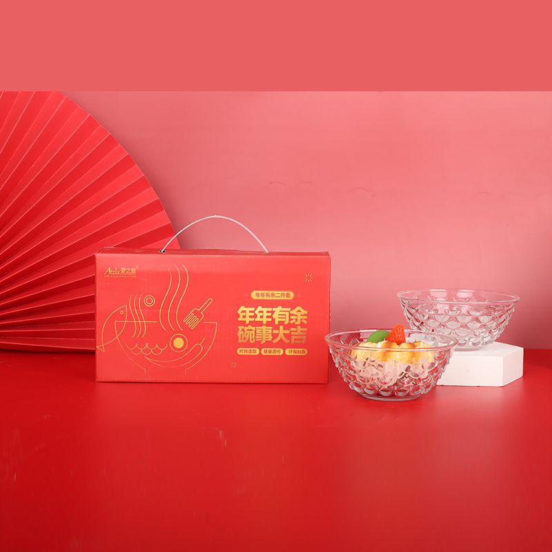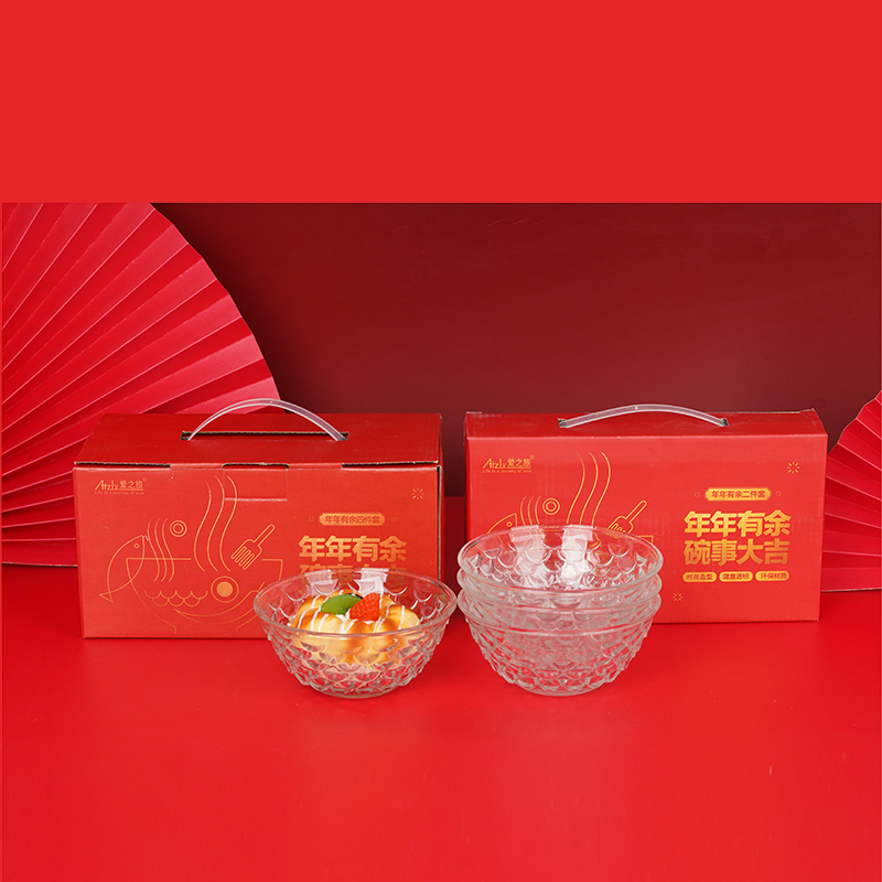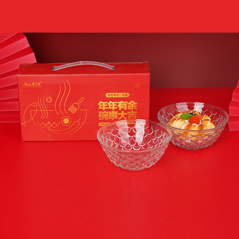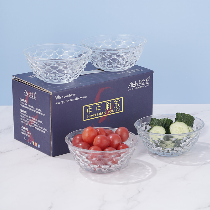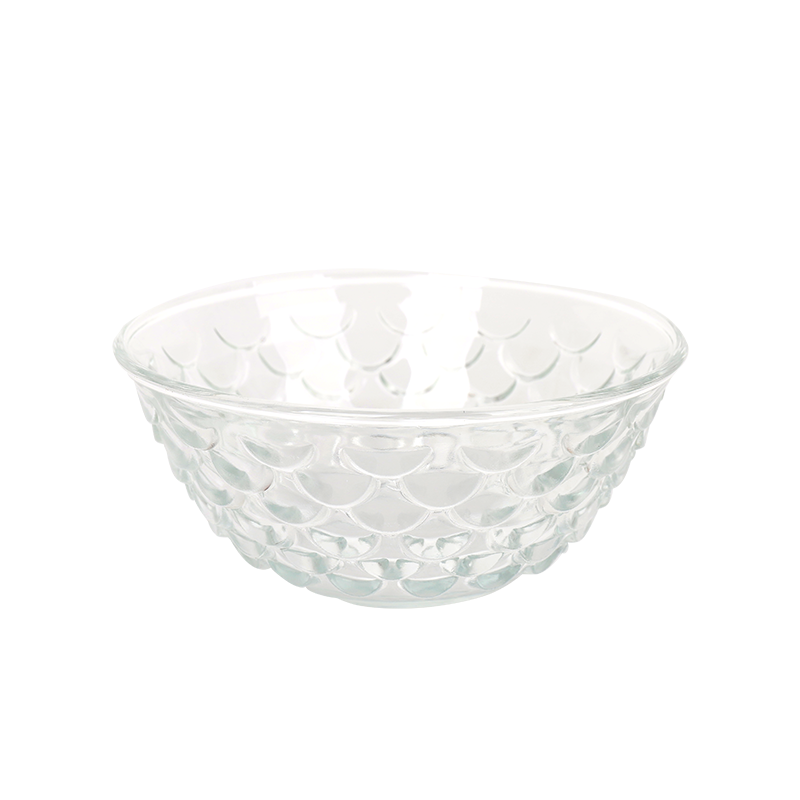 Transparent glass bowls with 3D fish scale textures, shimmering under light, symbolizing "Abundance Year After Year," perfect for festivals or home decor.Stylish & Functional Tableware